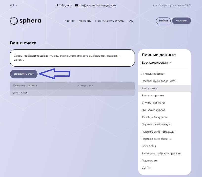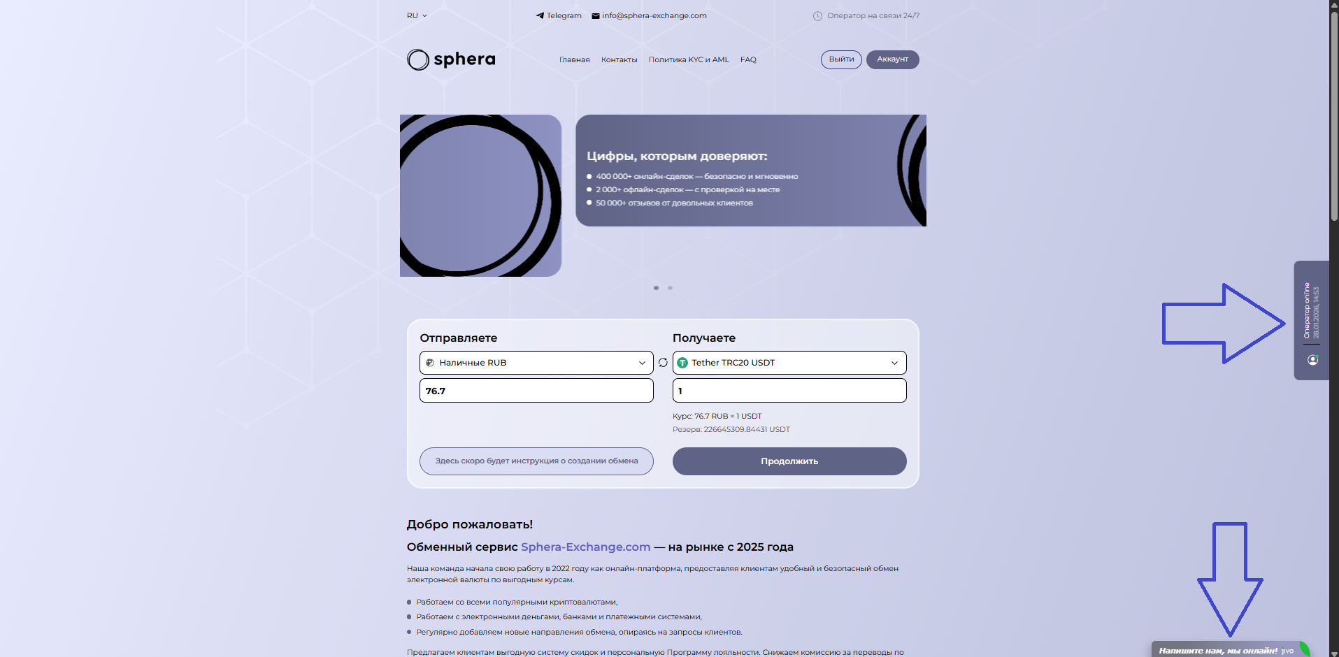 При нажатии на кнопку открывается чат с оператором. Он ответит на все вопросы и поможет разобраться с трудностями. Если у вас возникли спорные моменты и нужна не просто консультация, а решение конкретной проблемы, то воспользуйтесь электронной почтой info@sphera-exchange.com.