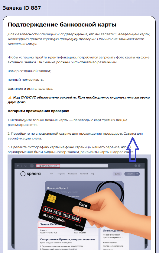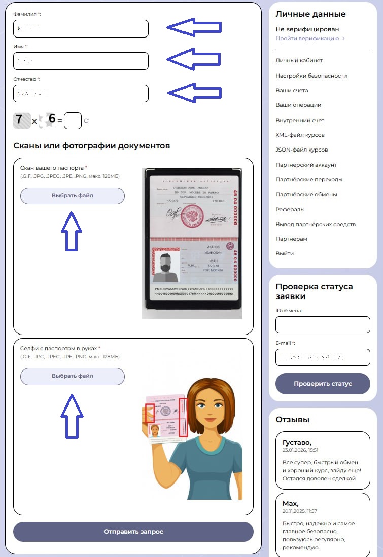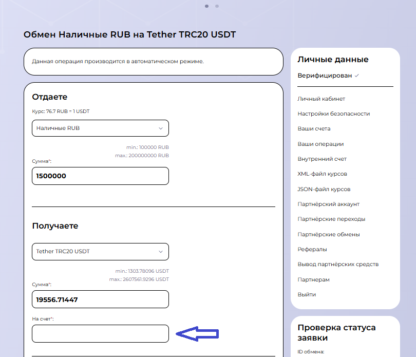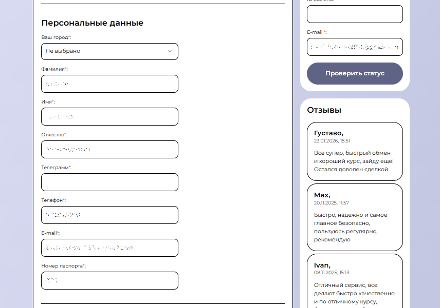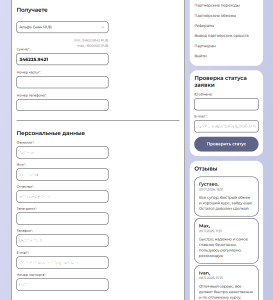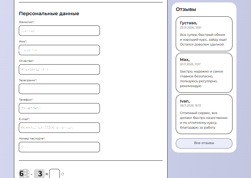 При создании заявки система запрашивает персональные данные, включая ФИО, контактную информацию и платежные реквизиты. Эти данные используются исключительно для проведения транзакции и защиты пользователей в рамках KYC и AML.